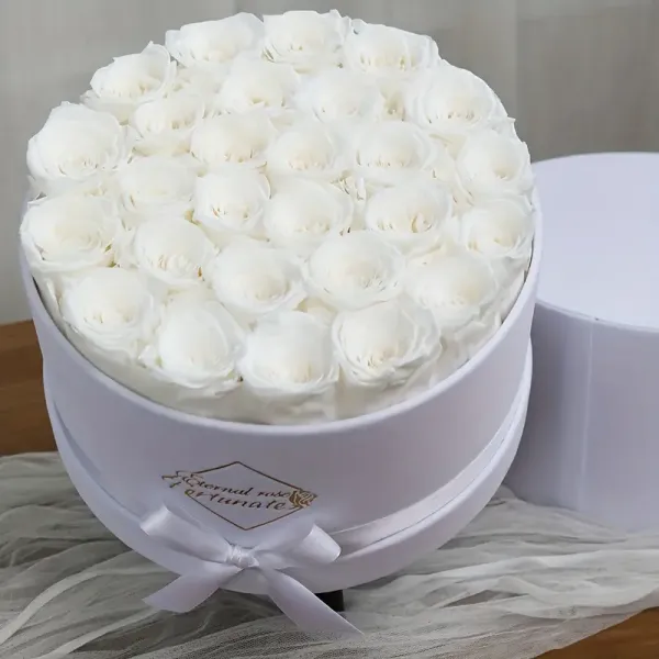 27 Preserved White Roses – Round Velvet Hat Box